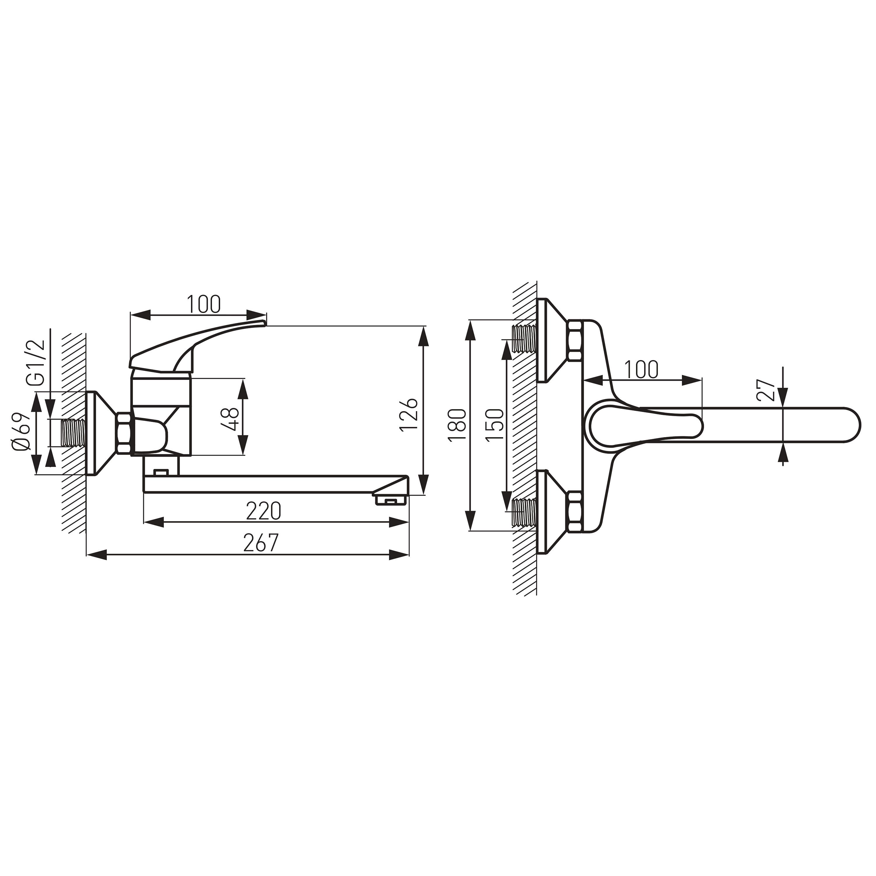 Regulator ceramiczny Montaż naścienny Aerator M24x1 Przyłącze mimośrodowe G½ rozstaw 150 ± 20 mm Obrotowa wylewka Chrom